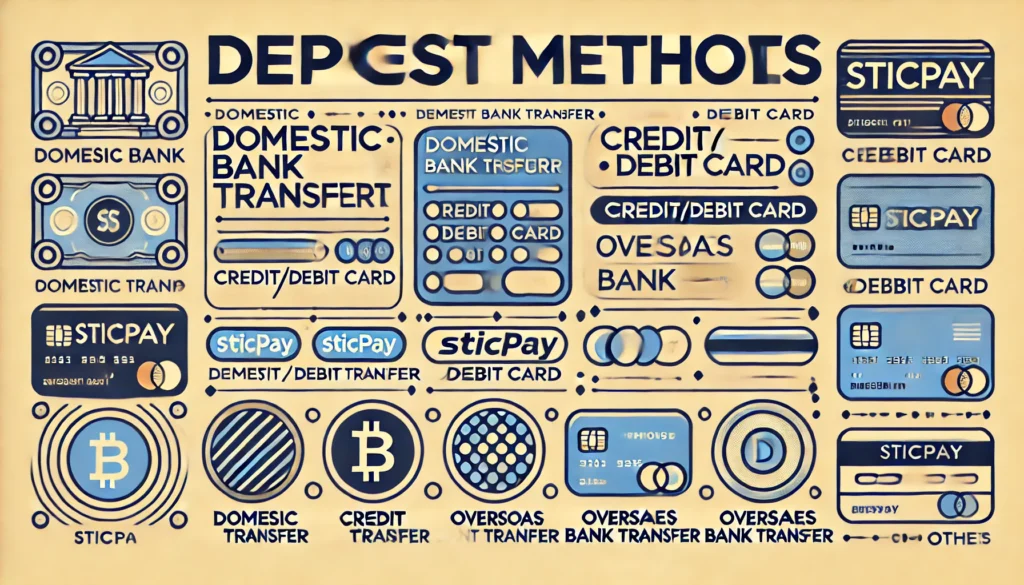 STICPAYでは、国内銀行送金、クレジット/デビットカード、仮想通貨、海外銀行送金など、様々な入金方法が利用できます。一部の海外FX業者では、bitwalletや銀行振込などの方法も利用可能です。